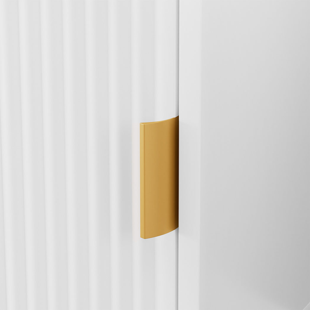 TV Cabinet. This elegant piece features a pristine white finish with sophisticated grooved doors, complemented by shimmering gold metal handles and legs that add a touch of contemporary luxury to any room. The design is not only visually appealing but also highly practical, with a sturdy construction that includes anti-tip devices to ensure stability and safety. Ideal for homes with children or pets, this cabinet provides peace of mind while enhancing your home decor.